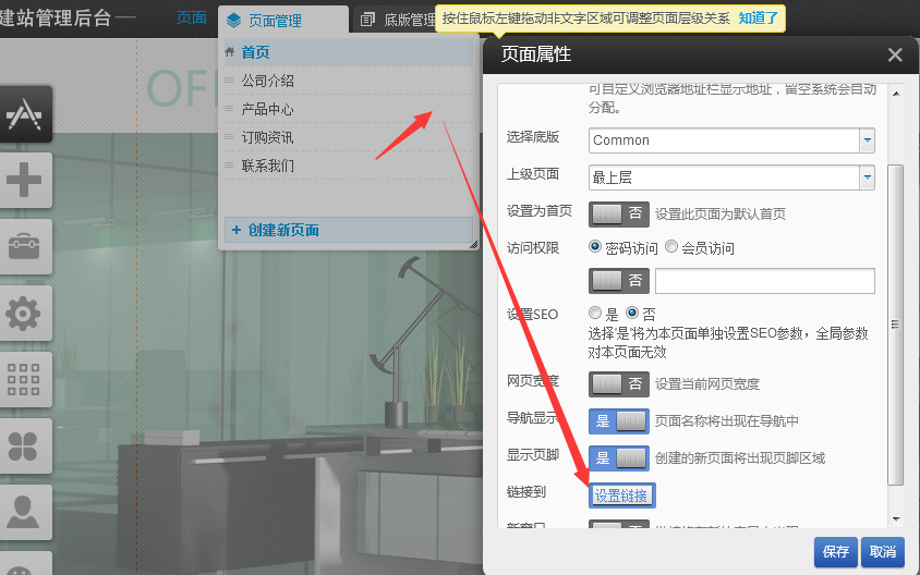 在页面管理中找到产品中心然后点击属性-》选择设置链接