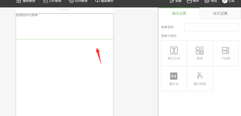 ③.表单子组件只能放在表单容器中,并且可以单独设置样式 以单行文本为例,选中之后,左侧会出现单行文本的属性设置和样式设置,可以设置单个组件的样式等